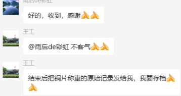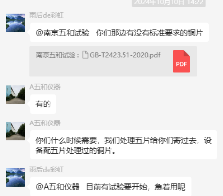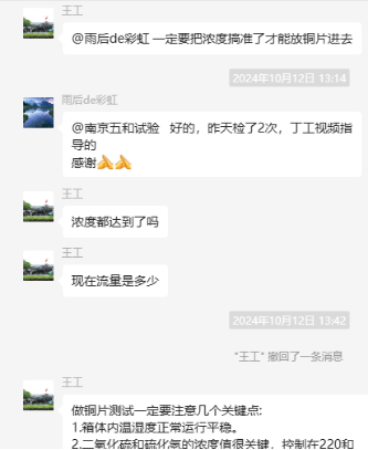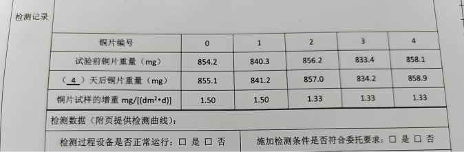 為了更好地說明銅片試驗的重要性,下面分享一個檢測公司的銅片試驗實際案例:2024年8月份合肥******檢測技術有限公司第一次采購我司一臺型號為“WHQ-300B”型的混合氣體腐蝕試驗箱,設備被運送到客戶指定的場地安裝調試運行。安裝調試后,客戶后期自行進行一次銅片增重試驗,我司技術人員進行線上指導操作,試驗結束之后客戶將數(shù)據(jù)發(fā)給我司,以下是客戶和我司聊天記錄以及客戶做的數(shù)據(jù)信息: