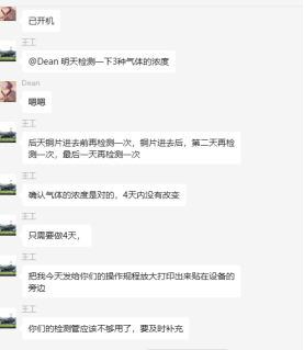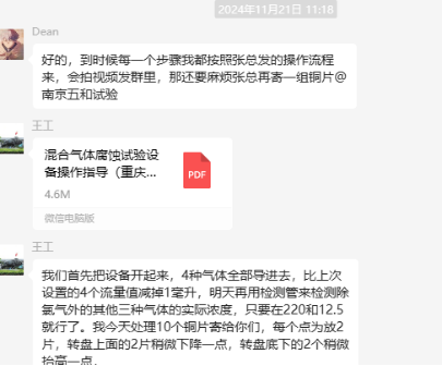 20248月份重慶******第三方檢測公司次采購我司一臺型號為“WHQ-300B”型的混合氣體腐蝕試驗箱,設(shè)備被運送到客戶指定的場地安裝調(diào)試運行。客戶后期自行進(jìn)行一次銅片增重試驗,起初試驗結(jié)果不是很理想,,試驗的流程和注意事項未了解透徹,我司針對以上信息,整理了操作指導(dǎo)作業(yè)書進(jìn)行幫助理解;通過理論知識和我司技術(shù)人員線上指導(dǎo)操作的配合,該增重試驗很成功。試驗結(jié)束之后客戶將數(shù)據(jù)發(fā)給我司,以下是客戶和我聊天記錄以及客戶做的數(shù)據(jù)信息